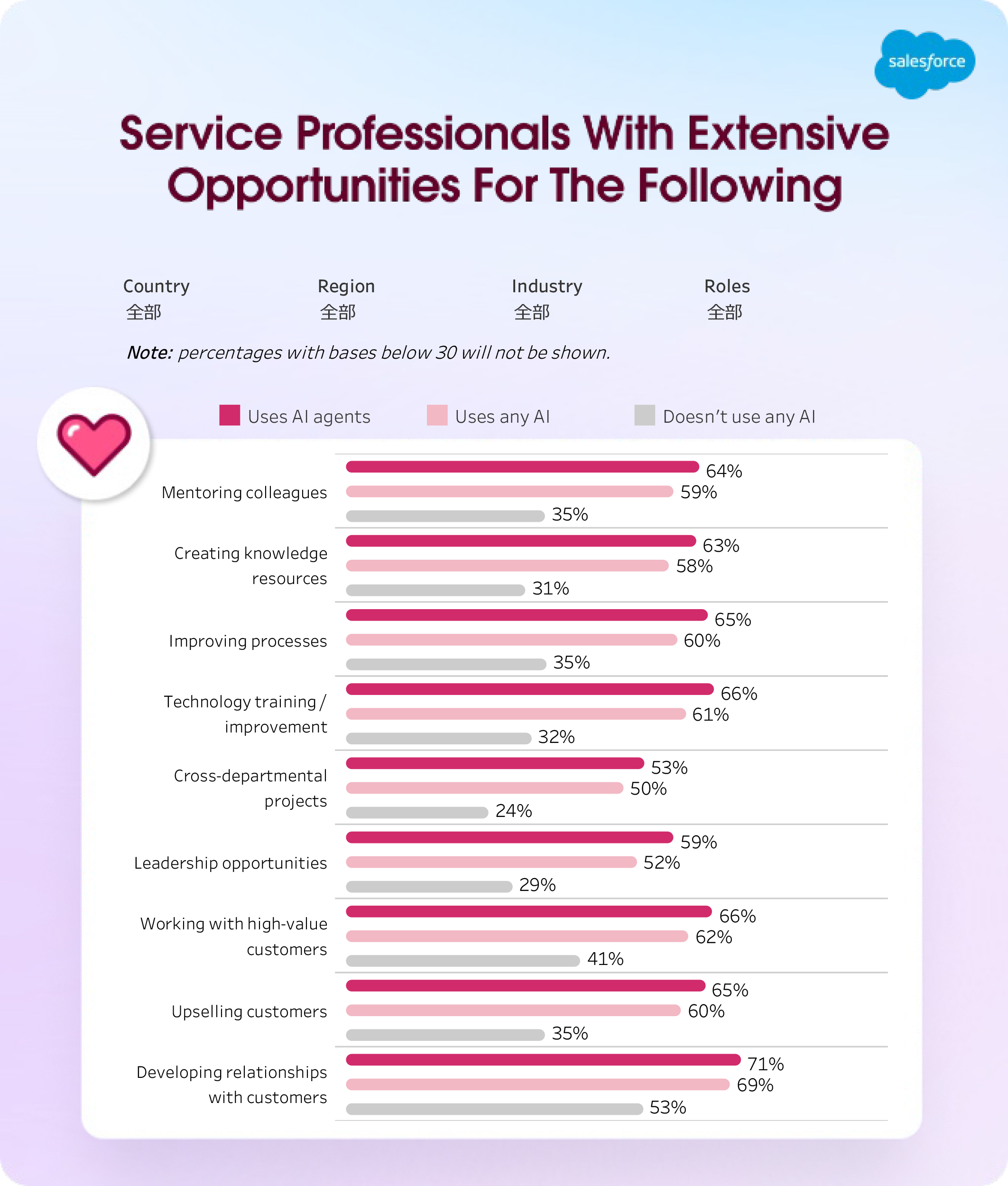 这些零散节省的时间将产生累积效应。 与未使用智能技术的同行相比,启用AI代理的服务代表更有可能指导同事、牵头跨部门项目及优化工作流程。同时,他们获得更多服务高价值客户的机会,并更频繁承担团队领导职责——这充分表明AI正在为服务人员打开通往更具影响力、更能推动职业发展的工作之门。