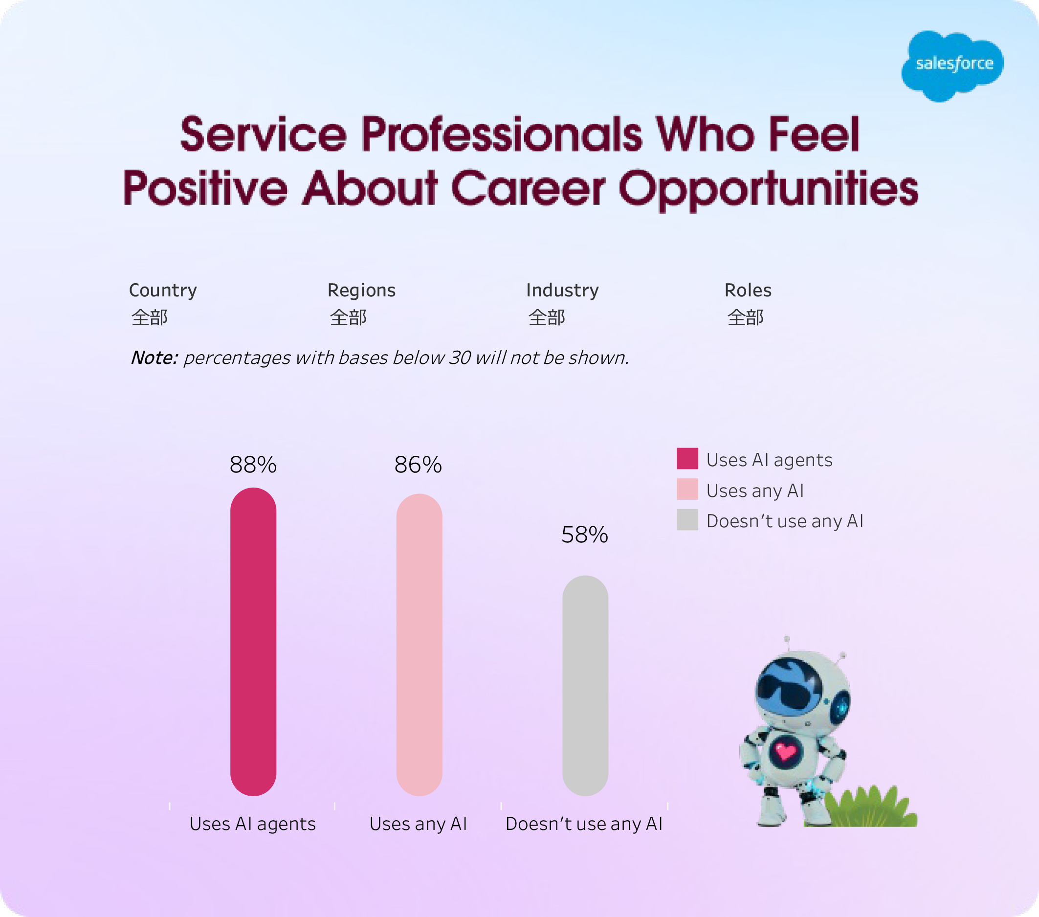 事实上,71%配备AI的服务代表表示,AI正在为他们创造发展机遇。具体表现在:86%的服务人员已通过使用 AI 工具培养了新技能,81%的人表示使用AI工具使其岗位职责变得更加专业化。最重要的是,使用AI的服务人员对其职业发展充满信心,其中使用AI代理的人员对职业前景的乐观程度最高。这一现象或许反映了前瞻性技术先行者存在的选择性偏差,但恰好与他们反馈的技能培养、岗位专业化、获得领导力机遇相契合。