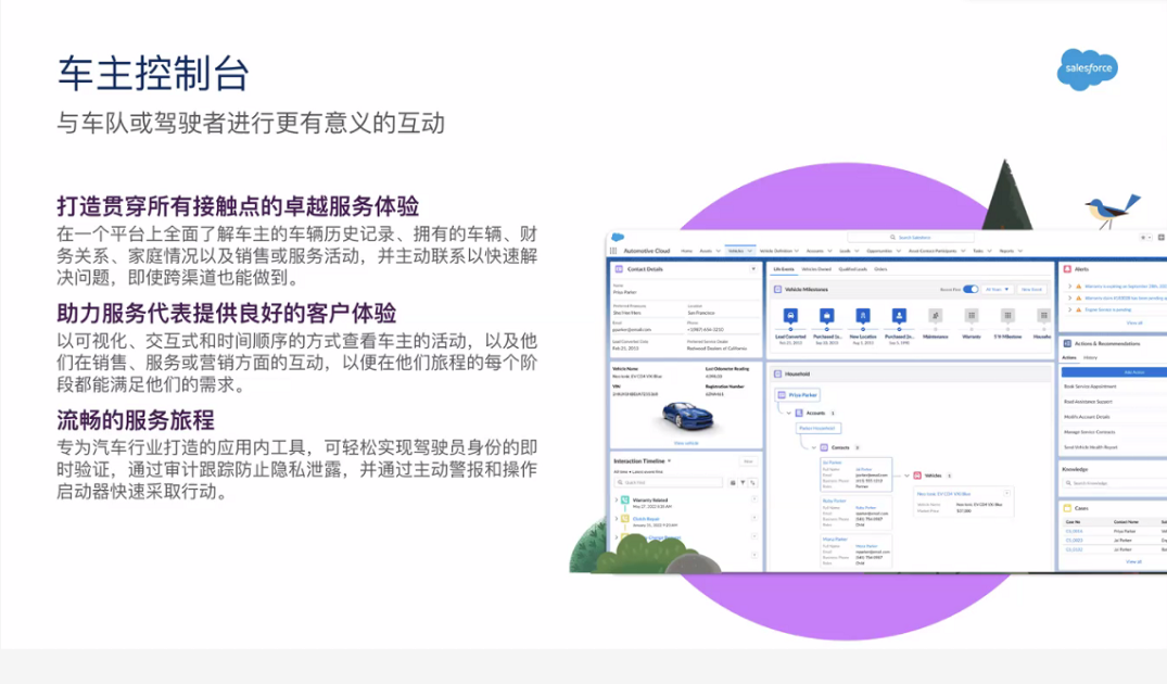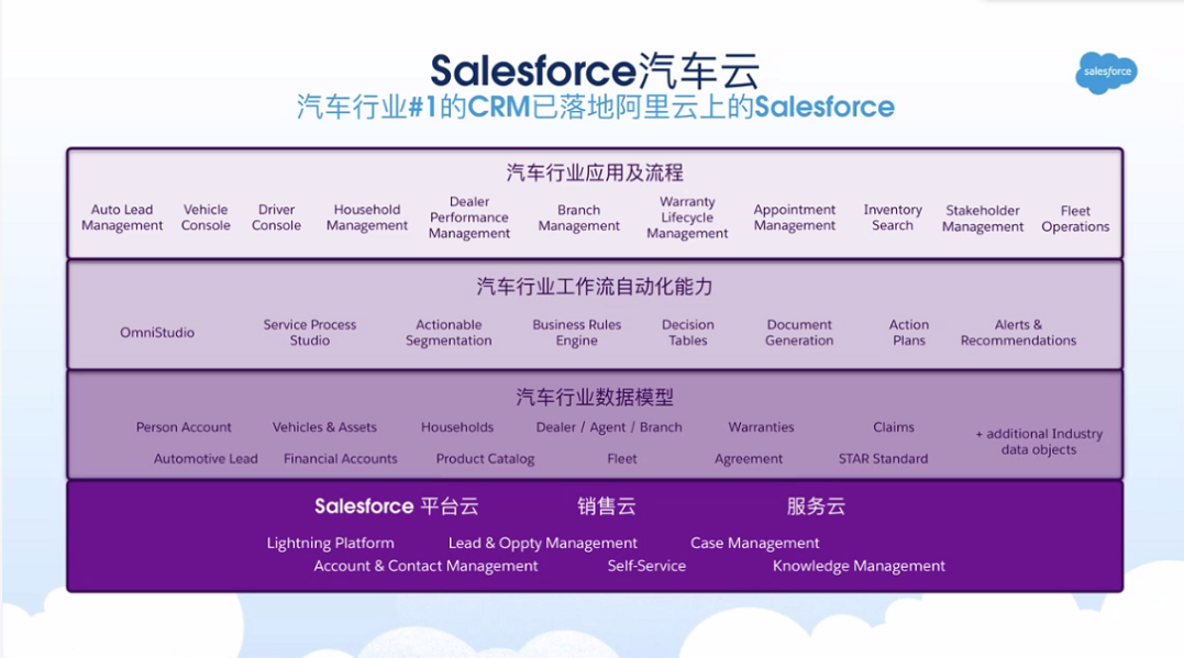 继生命科学行业解决方案 Health Cloud 之后,Salesforce Automotive Cloud 汽车云正式落地中国。构建在 Salesforce 平台、销售云、服务云核心能力之上,它还预置了汽车行业专属数据模型与业务流程,覆盖从车辆管理到经销商协作的全链路,为车企提供一套开箱即用的解决方案。