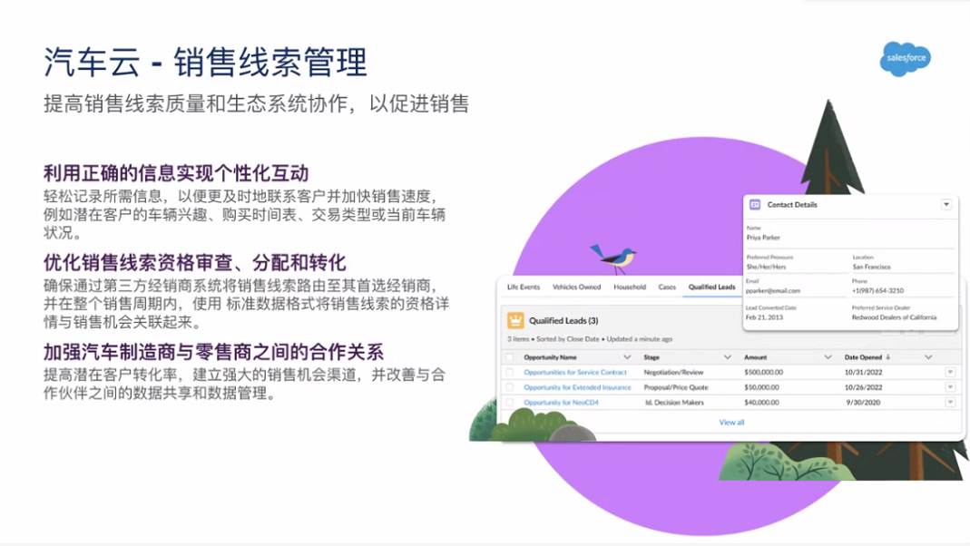 通过第三方经销商系统,确保线索自动路由至客户偏好的经销商;在整个销售周期中,使用 STAR 标准 ADF 数据格式,将线索资质详情始终关联到商机记录。