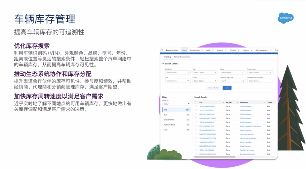 通过 VIN、外观颜色、品牌、车型、年份、距离或位置等灵活条件,在整个汽车网络中快速查找库存车辆。