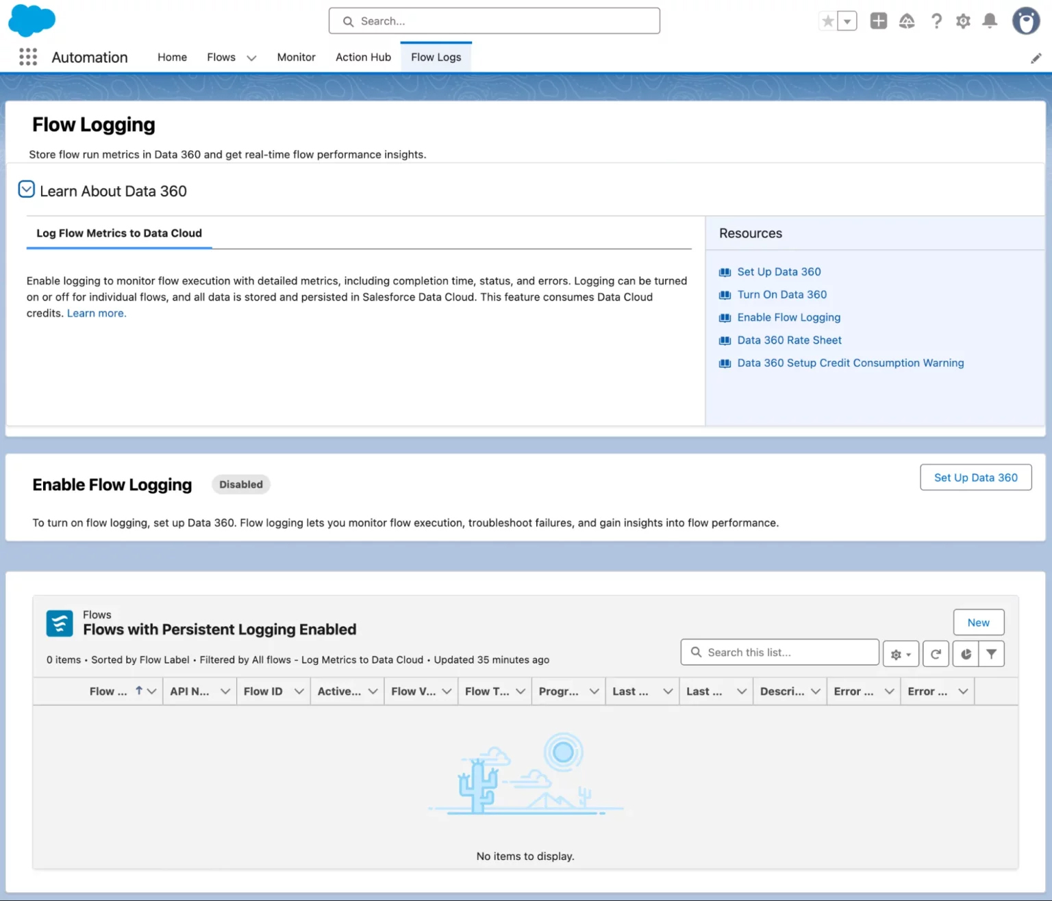 自动化应用新增了一个专属标签页及配套功能!现在,当您选择将Flow运行指标存储在 Data 360 时,会有一个专用的 Lightning 页面来管理它们。