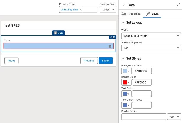 借助Spring '26版本,您可以遵循专业设计团队的指导,调整屏幕流中屏幕界面上各类元素的颜色。此项功能可通过屏幕元素属性面板中新增的样式选项卡进行设置。
