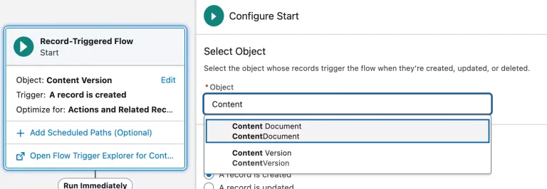 现在,您可以基于内容文档和内容版本记录创建记录触发流。这意味着,当文件被创建或更新时,即可触发流程运行。