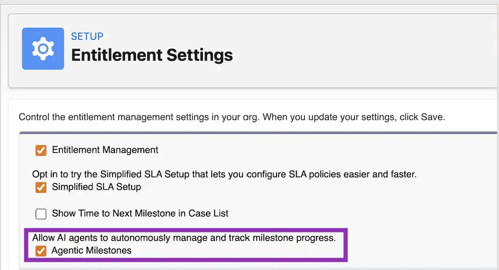功能启用后,管理员可在 SLA 服务策略中,将指定里程碑设置为智能自动化模式,并通过提示词编辑器(Prompt Builder)自定义消息文案风格与内容规范,后续全部沟通流程均由 Agentforce 自动完成。