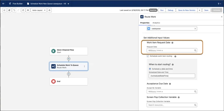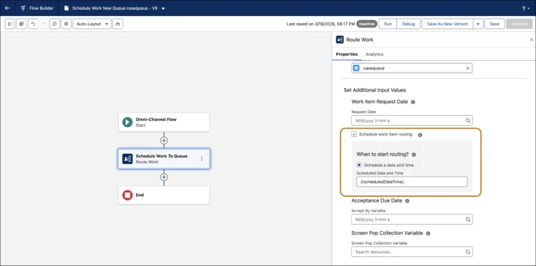 您可以在流程设计器(Flow Builder)中编辑全渠道流程时,通过「工作路由(Route Work)」操作配置并体验这些新能力。